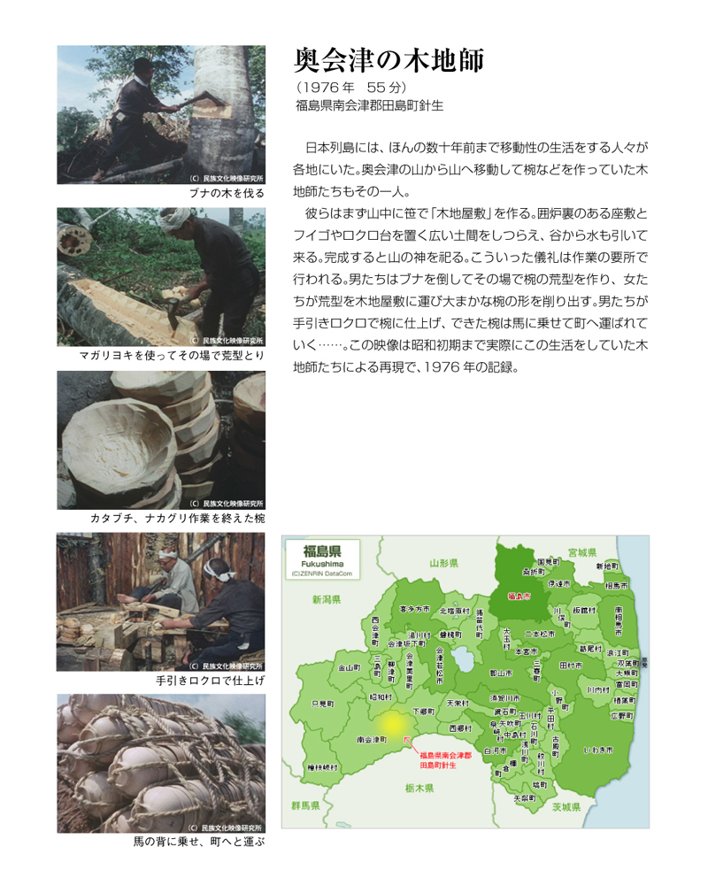 | 上映内容 | ・奥会津の木地師(55分) ・置茂庭 -摺上川の流れとともに-(52分) 【参考リンク】 奥会津 1 2 奥茂庭 1 2 |